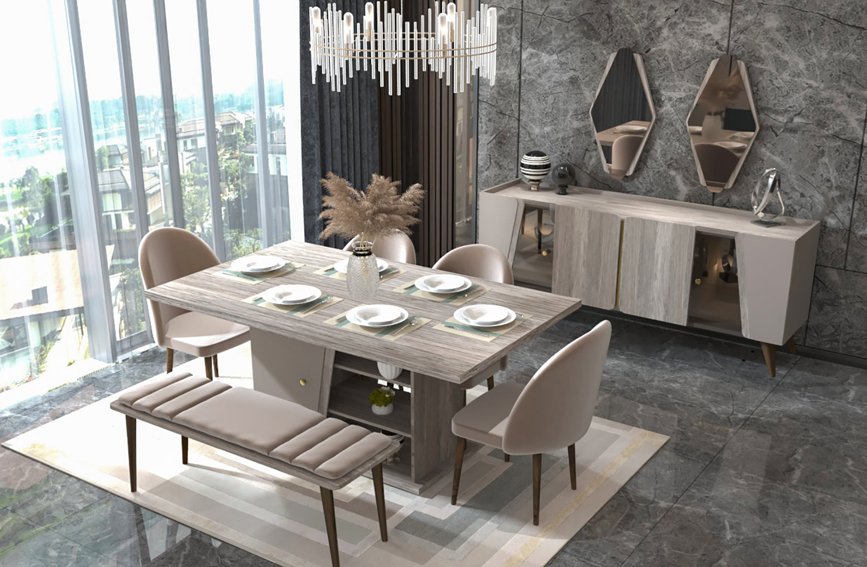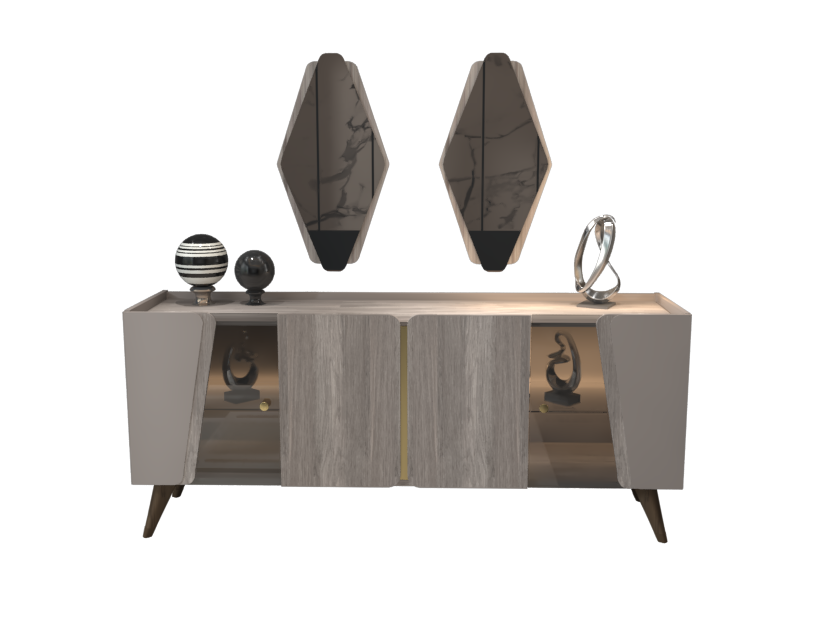 BUFFET: W: 50cm * L: 180cm * H: 80cm   |   MIRROR: W: 40cm * H: 80cm   |   DINING TABLE: W: 100cm * L: 180cm * H: 80cm   |   DISPLAY UNIT: W: 45cm * L: 90cm * H: 160cm